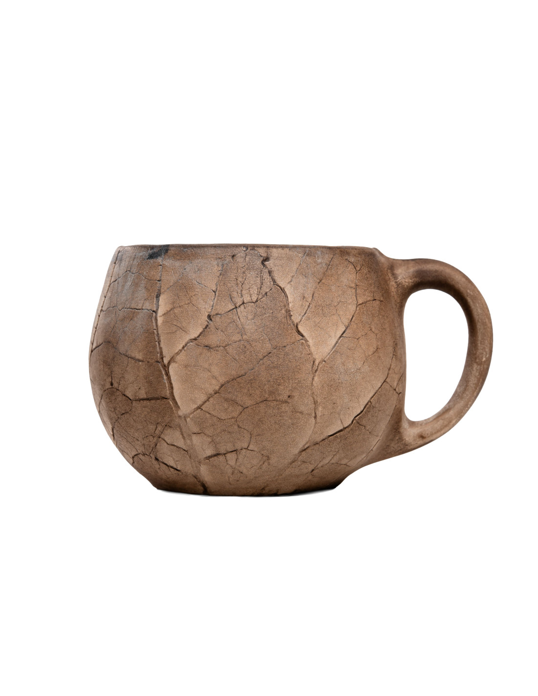 A 0.35 L cup with a handmade burdock leaf print from the Flora collection by Pokutskaya Ceramics.